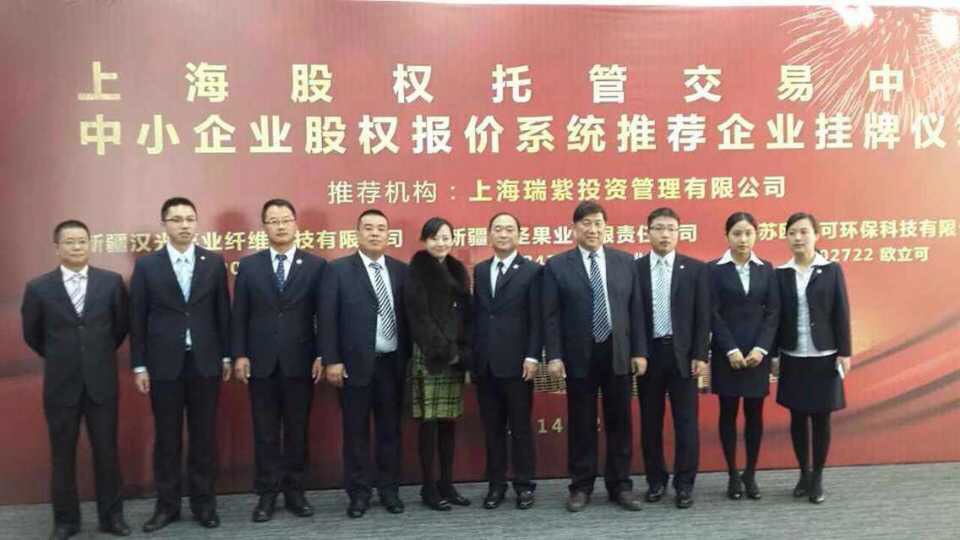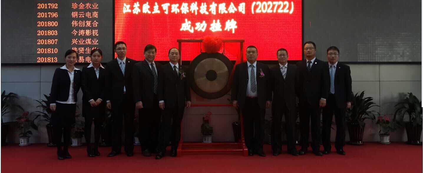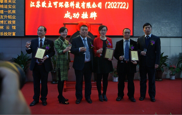 2014年12月5日中午11點18分,鳴鑼掛牌儀式在上海股權交易中心隆重舉行,江蘇歐立可環保科技有限公司董事長豐偉、總經理李繼強等高管出席掛牌儀式。江蘇歐立可環保科技有限公司董事長豐偉上臺致辭,他介紹道:歐立可自成立以來一直專注節能減排、綠色環保的產品研發及生產,針對水處理與節省燃氣等系統性解決方案,堅持創新、高效、團結、誠信,通過持續的技術創新和不斷突破,取得了今天輝煌的成就。