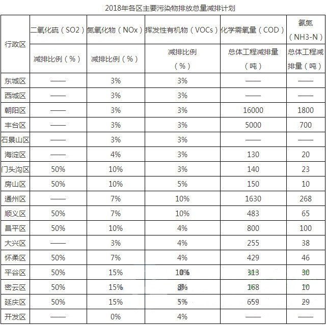 北京市環境保護局關于印發2018年各區主要污染物總量減排計劃和重點企業主要污染物總量控制任務的通知