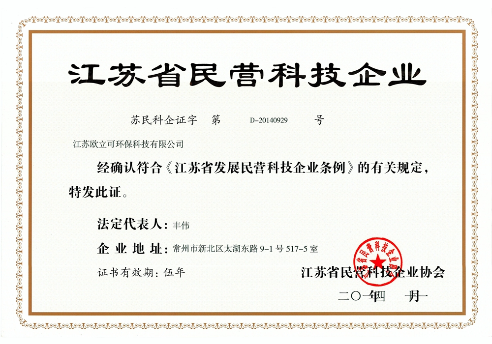 熱烈祝賀江蘇歐立可環保科技有限公司獲得江蘇省民營科技企業稱號!